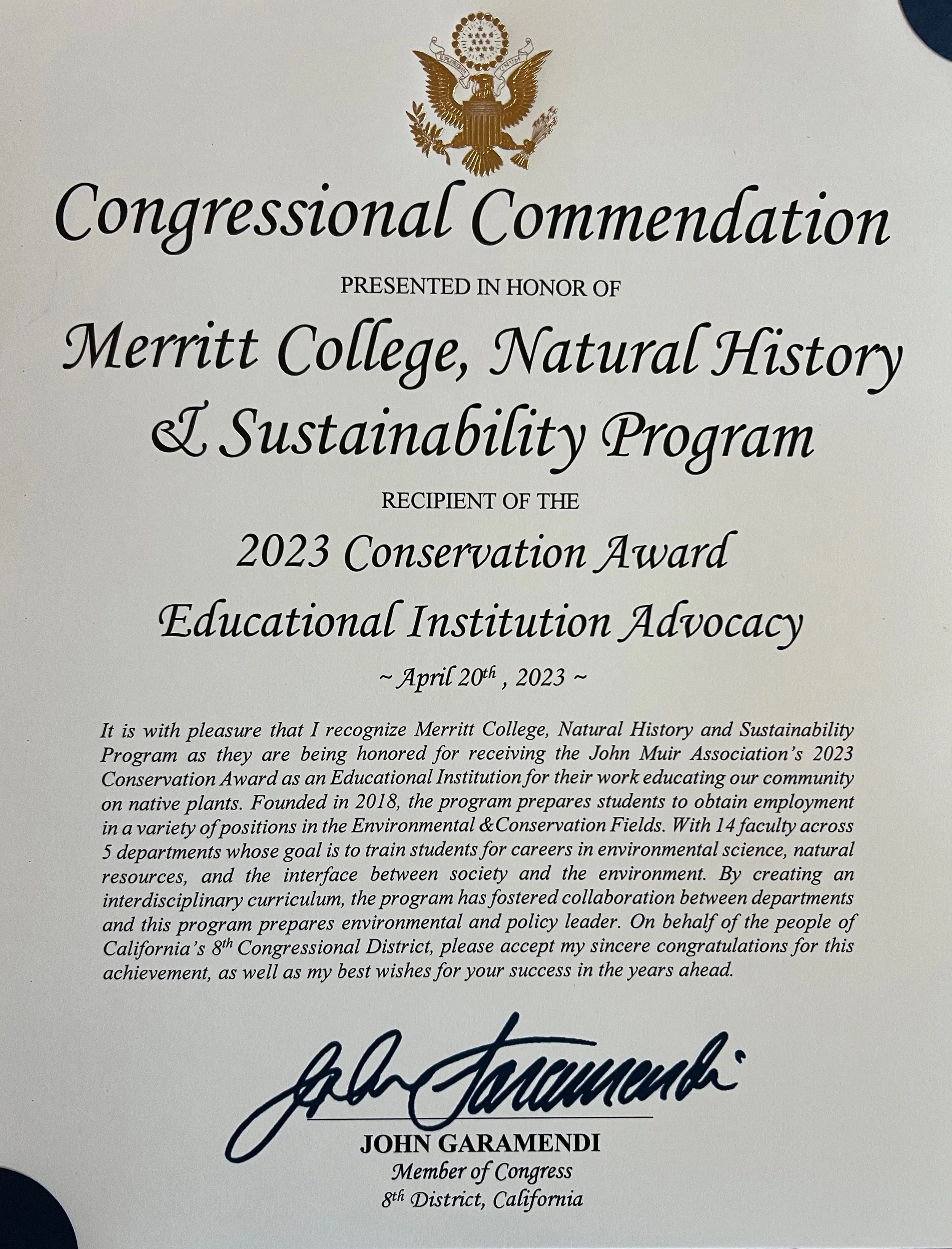 On Earth Day, 2023, the Natural History and Sustainability Program was honored with the John Muir Association Environmental Award for Environmental Education.